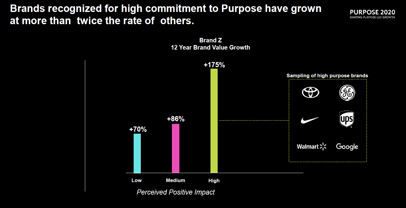 Brands that were outwardly purpose-driven in messaging grew by +175% in brand value growth over 12 years. [Kantar]